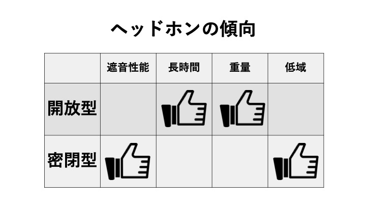 ざっくりと開放型と密閉型の違いを下記にて、まとめてみました。