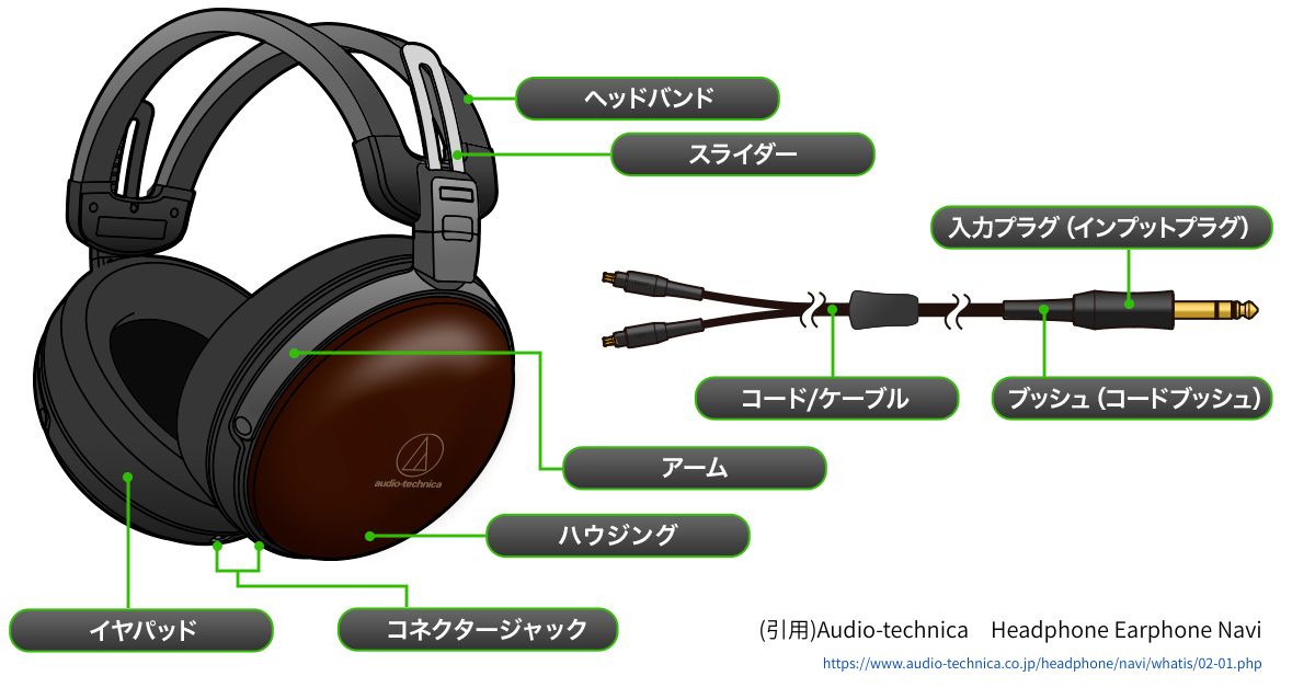 ヘッドホンの各部位・構造についてはAudio-technicaさんの紹介記事にて非常に分かりやすく紹介されています。